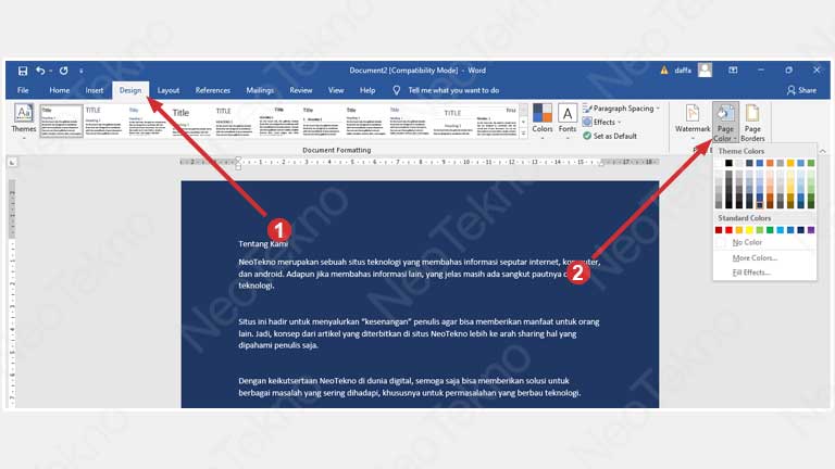 - Untuk membuat background, klik tab “Design” lalu pilih “Page Color”.